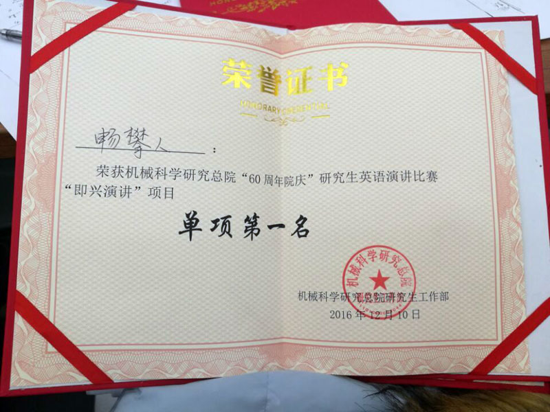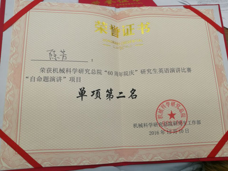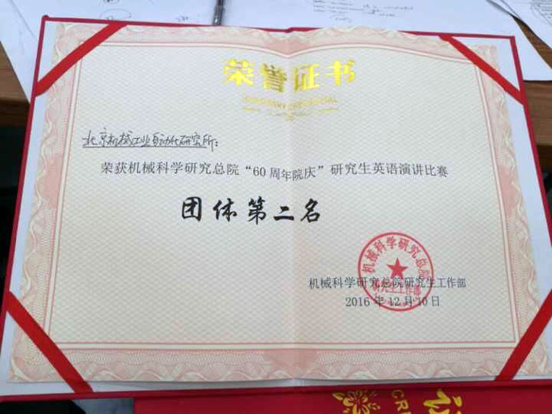 12月10日,北京機(jī)械工業(yè)自動化研究所(以下簡稱北自所)研究生代表隊(duì)參加了“迎院慶60周年”機(jī)械科學(xué)研究總院第二屆研究生英語演講比賽。此次比賽設(shè)“自命題演講”、“即興演講”和“創(chuàng)意表演”三項(xiàng)。      經(jīng)過賽前的精心準(zhǔn)備、刻苦訓(xùn)練,在緊張又熱烈的比賽過程中,北自所參賽隊(duì)員陳芳、暢攀人、支嘉斌,張超在語言能力、演講技巧等綜合表現(xiàn)優(yōu)秀,一舉奪得團(tuán)體第二名,其中暢攀人獲“即興演講”單項(xiàng)第一名,陳芳獲“自命題演講”單項(xiàng)第二名。      通過本次比賽,極大的提升了北自所在讀研究生學(xué)習(xí)英語的熱情和語言表達(dá)能力,讓同學(xué)們從書面學(xué)習(xí)到敢于開口說英語、勇于展現(xiàn)自我。同時(shí)增強(qiáng)了科研、學(xué)習(xí)、工作的積極性,為以后走上科研崗位奠定了良好的基礎(chǔ)。